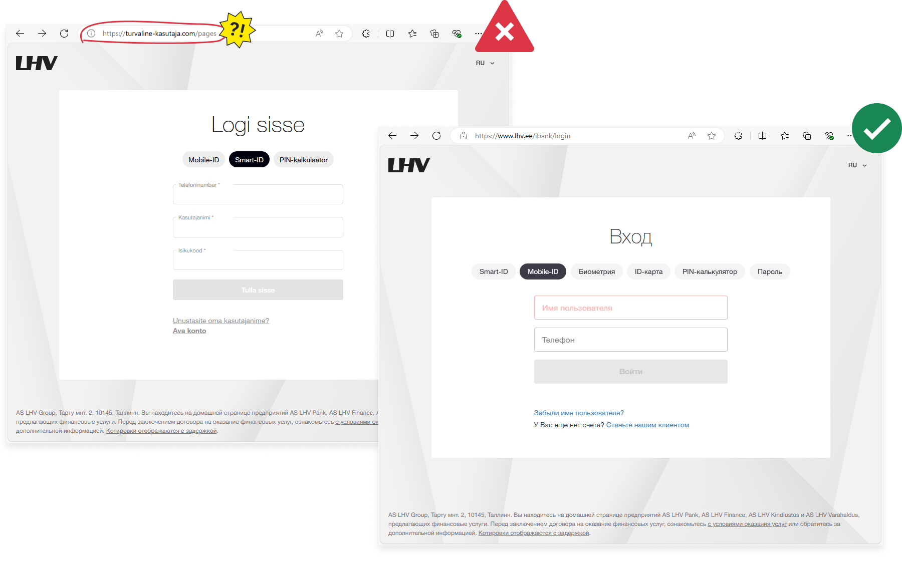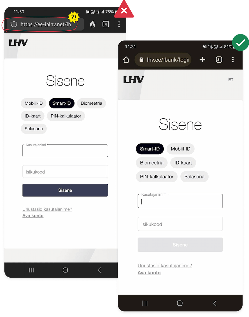 | Kas sõnumis on link, millele vajutamist oodatakse? NB! Õngitsuslehe veebiaadress võib olla peidetud ka lühiurl-i (tiny url) või QR-koodi taha taha. Ole sellega eriti ettevaatlik ja kasuta veebis lühilinkide pikaks tegemise tööriistu. | SMS-is palutakse vajutada kahtlasele veebilingile, mille internetiaadress ei ühti asutuse tegeliku kodulehega. Veebiaadress võib olla väga sarnane õigele lingile, näiteks www.lhv.ee asemel www.Ihv.ee (kus väikese L asemel on suur i). | Kirjas palutakse vajutada kahtlasele veebilingile, kus veebilehe nimi ei ühti asutuse veebilehega, millelt see e-kiri väidetavalt tuli. Veebiaadress võib olla väga sarnane õigele lingile, näiteks www.lhv.ee asemel www.Ihv.ee (kus väikese L asemel on suur i). |