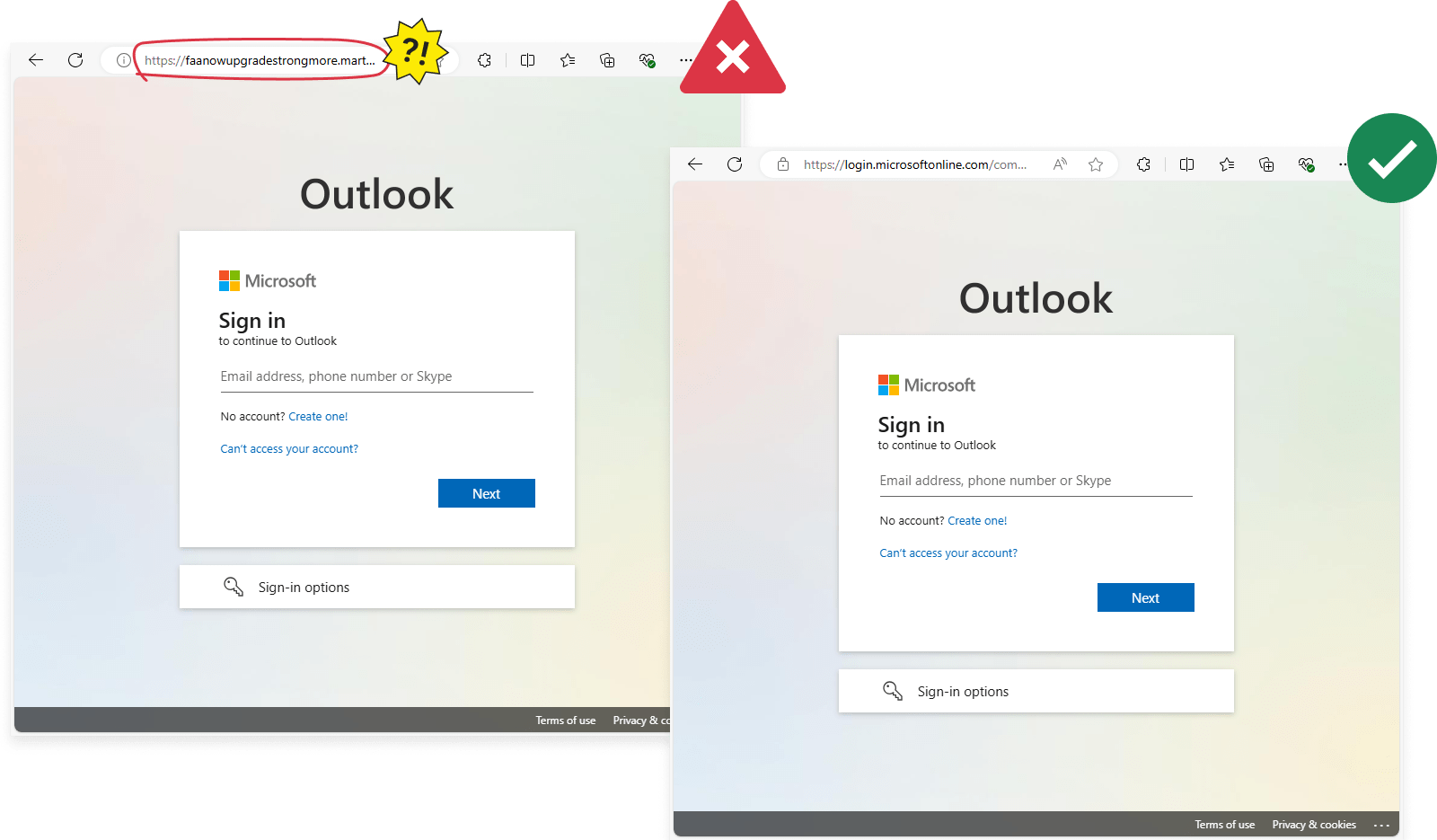 Kõiki õngitsuslehti saab tuvastada veidra veebiaadressi järgi. Võrdluseks on toodud ka päris veebilehed, mida imiteeritakse.