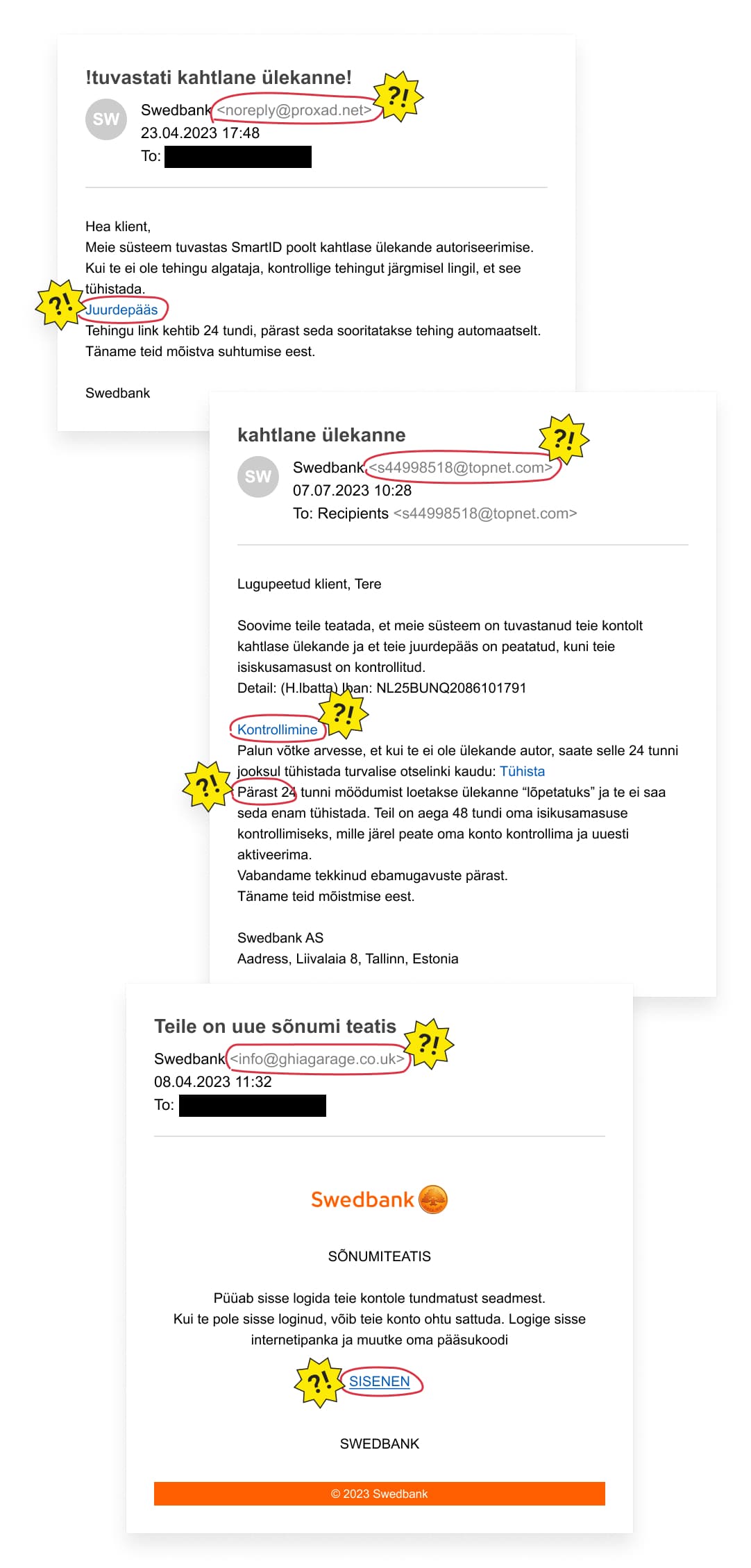 - Saatja nimi on küll Swedbank, aga e-posti aadress on erinev. Swedbankilt tulnud kirjad peavad olema ametliku lõpuga “@swedbank.ee”, @swedbank.com” vmt.
